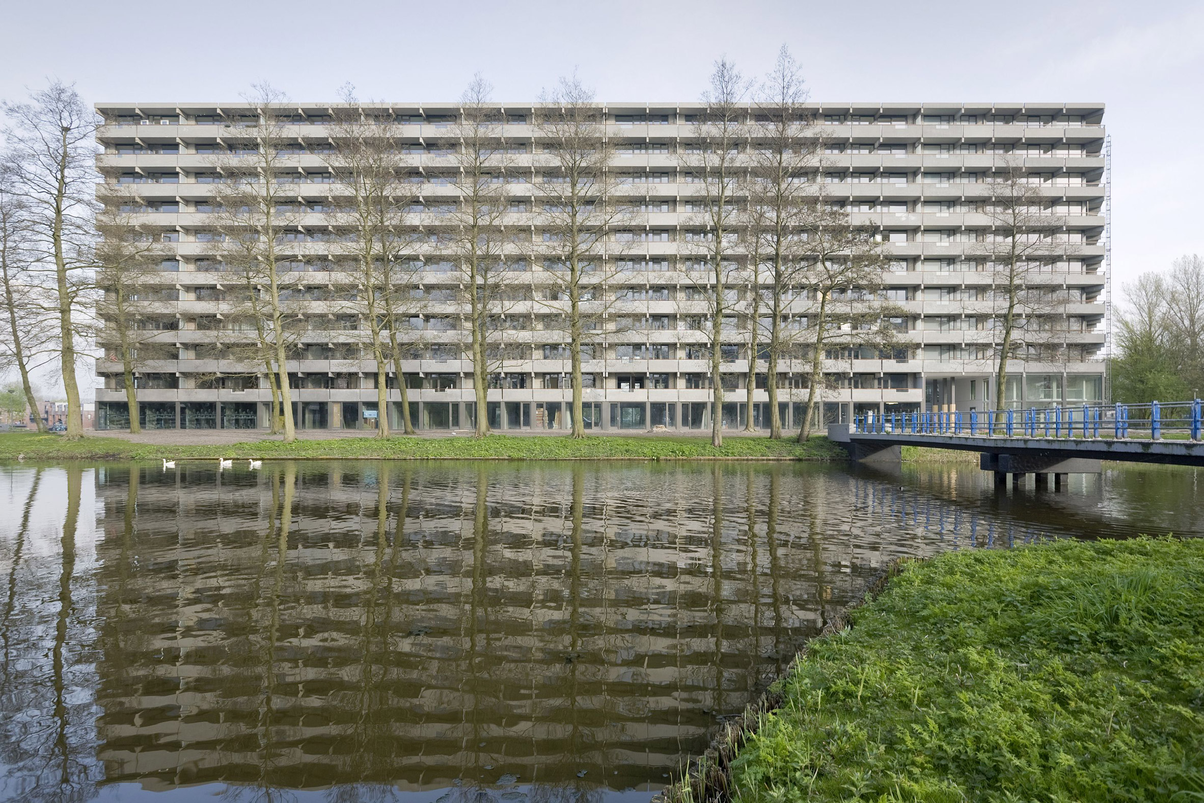 The Kleiburg apartment building – a colossal, 400-metre-long block containing 500 apartments over 11 storeys – is one of several blocks laid out in a hexagonal plan to form an estate to the southeast of Amsterdam. DeFlat was selected as the winner of the Mies van der Rohe Award 2017 from a shortlist of five projects, including a British housing scheme, museums in Denmark and Poland, and a memorial in France.