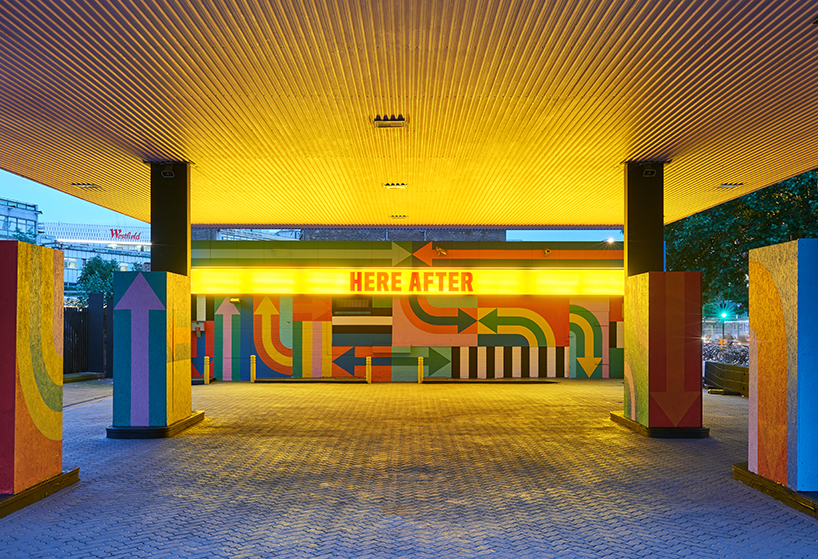 Craig & Karl have playfully transformed a disused gas station in London’s white city district into a multi-colored canvas. ‘Here after’ pays homage to the region’s ties to British broadcasting history, mimicking the bright and bold hues of a television test card. ‘We view this project as the petrol station’s second life, or ‘wonder years’, which led us to use the words ‘here after’ as a reference to heaven or utopia,’ the duo describes. ‘Now that the petrol station has fulfilled its duty, so to speak, it’s free to enjoy itself.’