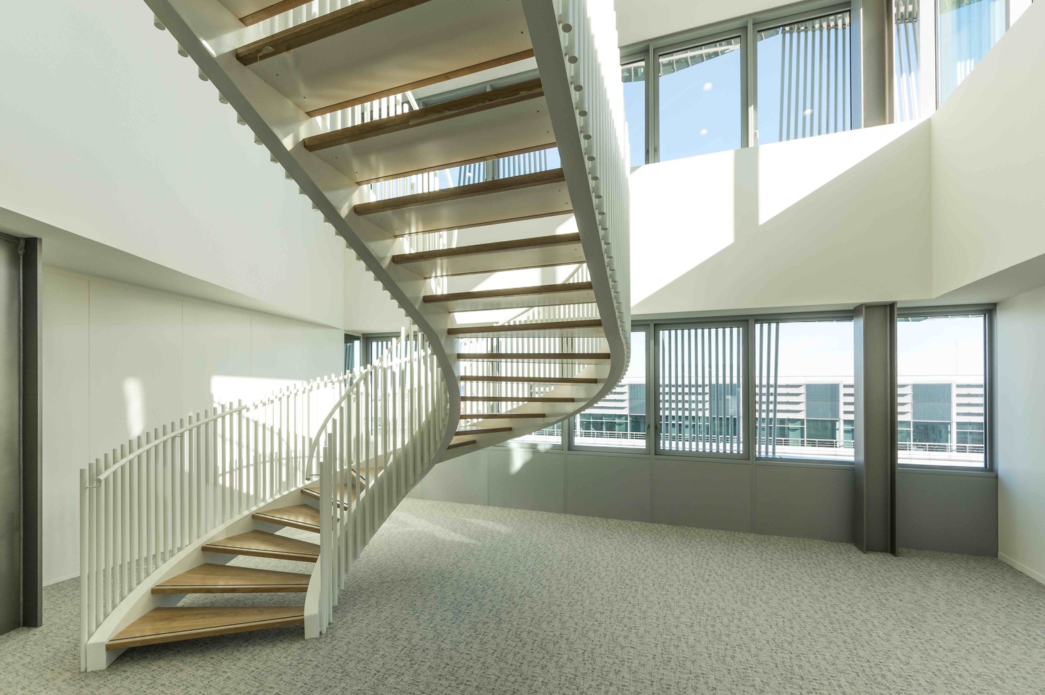 In the upper floors, the plates are organized according to a framework of 1.35 m, making it possible to create either partitioned or open plan offices. The slight overhang of the attic section is achieved by the rotation and folding of the various volumes facing the Avenue de France.