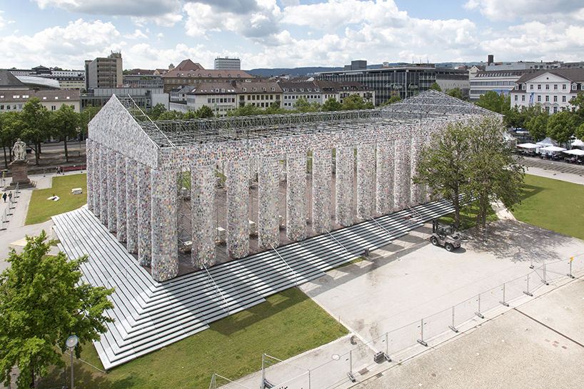Minujín’s ‘Parthenon of books’ is presented as part of Documenta 14 — an art festival and exhibition taking place in Kassel, Germany, and Athens, Greece this year. The 10,000 collected texts used to give shape to the installation have been secured in protective wrapping and mounted to a monumental colonnade and open roof structure, mirroring the architecture of the ancient Greek temple. In collaboration with students from the university of Kassel, a list of more than 70,000 forbidden books was compiled and shared with the public as a call to action for donation, making the audience a part of the artistic experience. Minujín contradicts the Parthenon’s symbolism of democracy to demonstrate the censorship of writing, opposition of expression, and oppression of cultural knowledge that has existed throughout history.