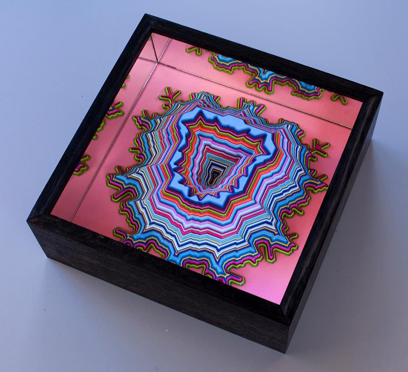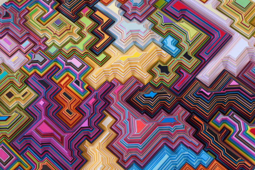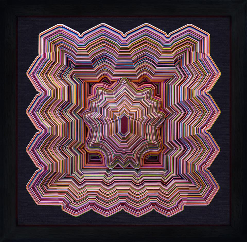 Leary‘s works start as two dimensional shapes or ‘territories’ as he calls them, but grow into worlds based on patterns and algorithmic systems that inform the artistic process of composition. Underpinning the conceptual rigor of his approach to his art-making is a fascination with the ‘nature of organization – different systems of organization, processes of organization and how we understand it. The artist is influenced by the technological processes of software such as adobe photoshop and how these digital tools are used to build and create virtual worlds. By combining the algorithmic process with an organic or intuitive artistic approach, Leary’s paper cut sculptures grow into extruding and submerging three-dimensional worlds.