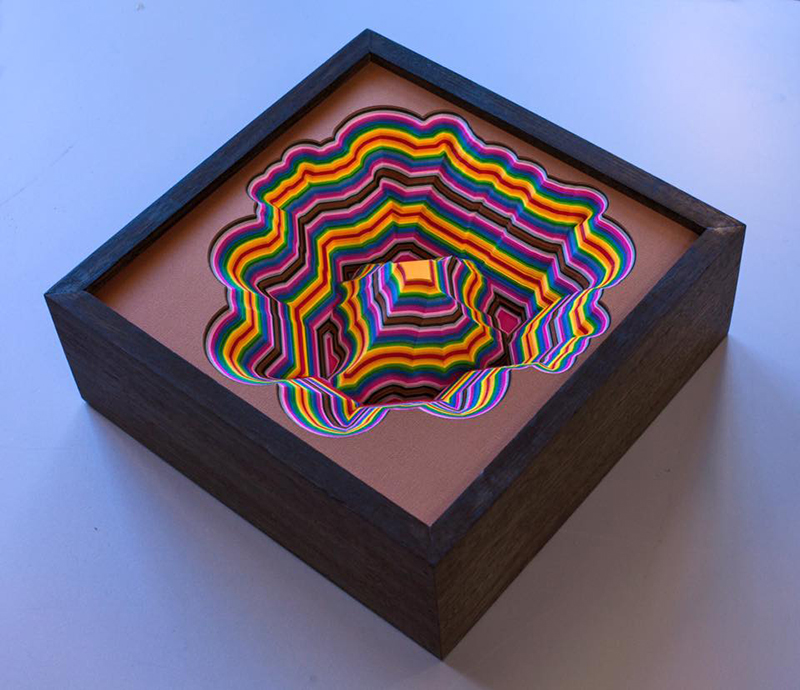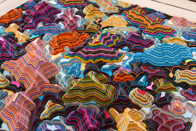 Leary’s artworks are very physical where each work is composed of a dense series of layered forms and colors. As the layers build upwards – creating both negative and positive spaces – he creates a diorama-like sculpture that is reminiscent of some science fiction land. They are pixelated in form and speak to a higher conceptual approach. He creates worlds that ‘mimic and highlight processes inherent within contemporary existence and technological growth, plus many other things’ he explains. The worlds he creates become a translation of a digital language into a physical and alluring object. These worlds can seem, at first glance, like chaotic color-masses, but on closer investigation what becomes evident is a hyper-ordered landscape of color and texture.