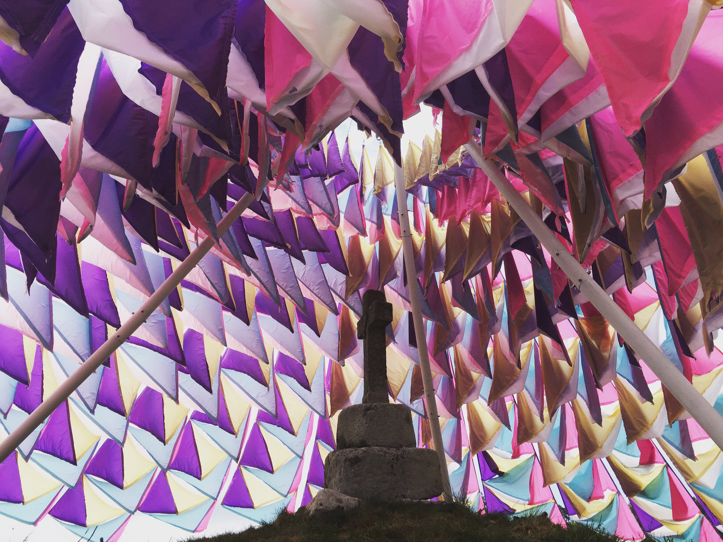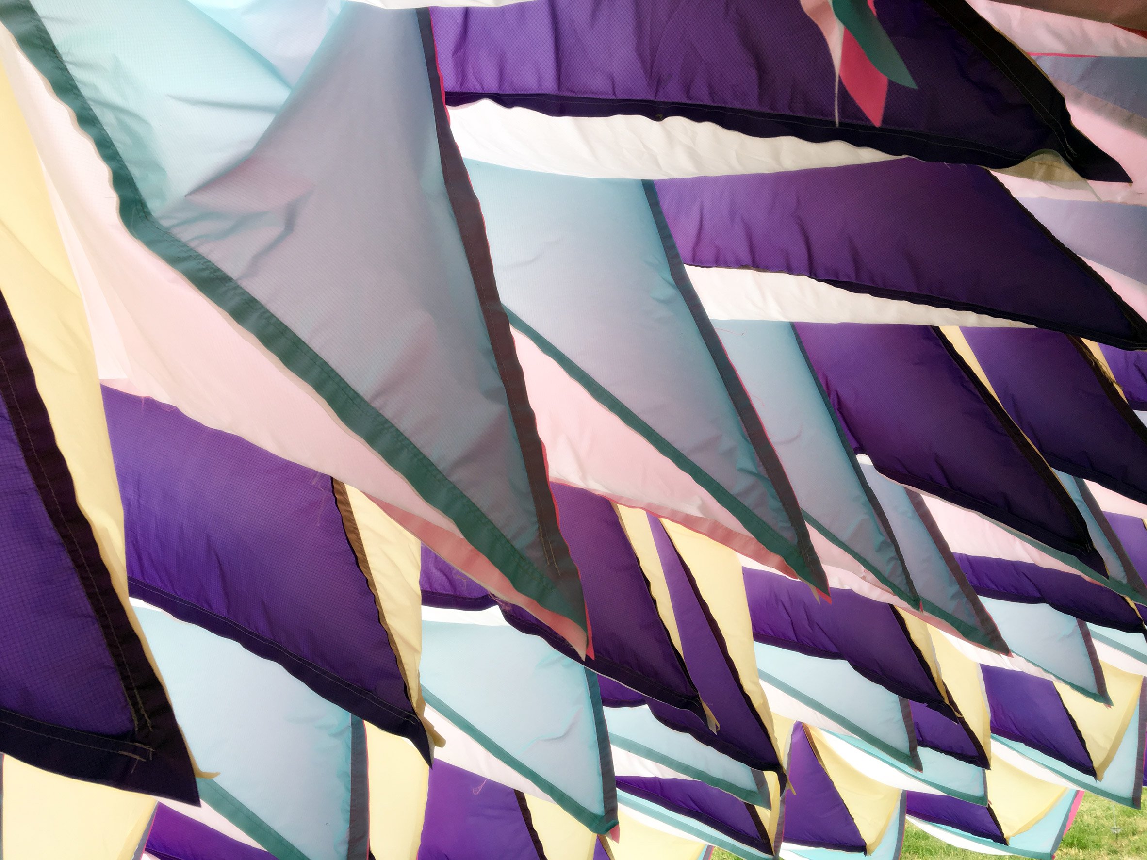 Also inspired by the surrounding volcanos and mountains is the installation's pointed tripod base, which is held to the ground by 30 tensioned steel rope lines. The conical form of the exterior features 30 inflatable wind-catching sections, sat in between stabilising ropes. Each section is made up of unique windsocks, all various widths and depths, which continuously fill up with air, altering the appearance of the fabric interior.