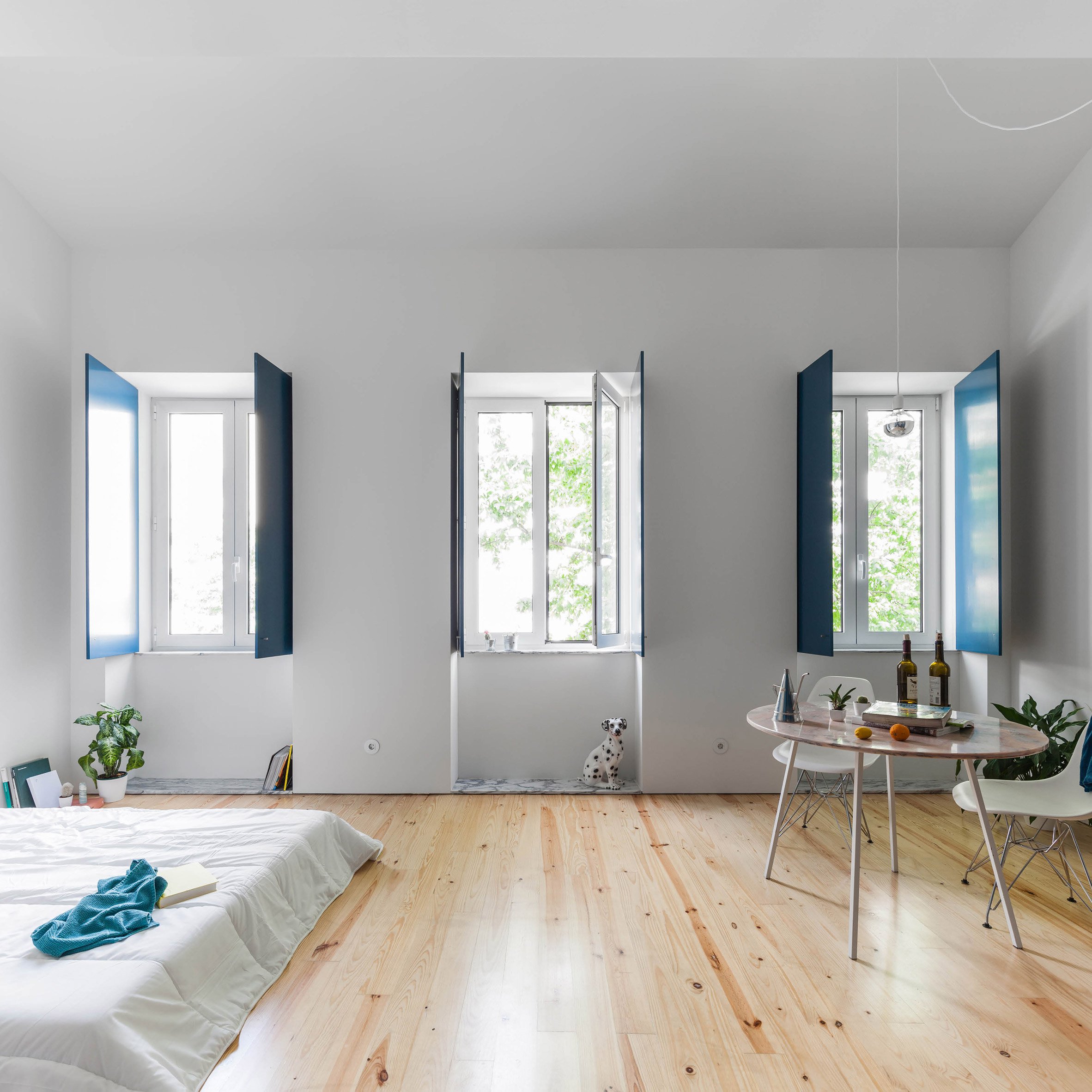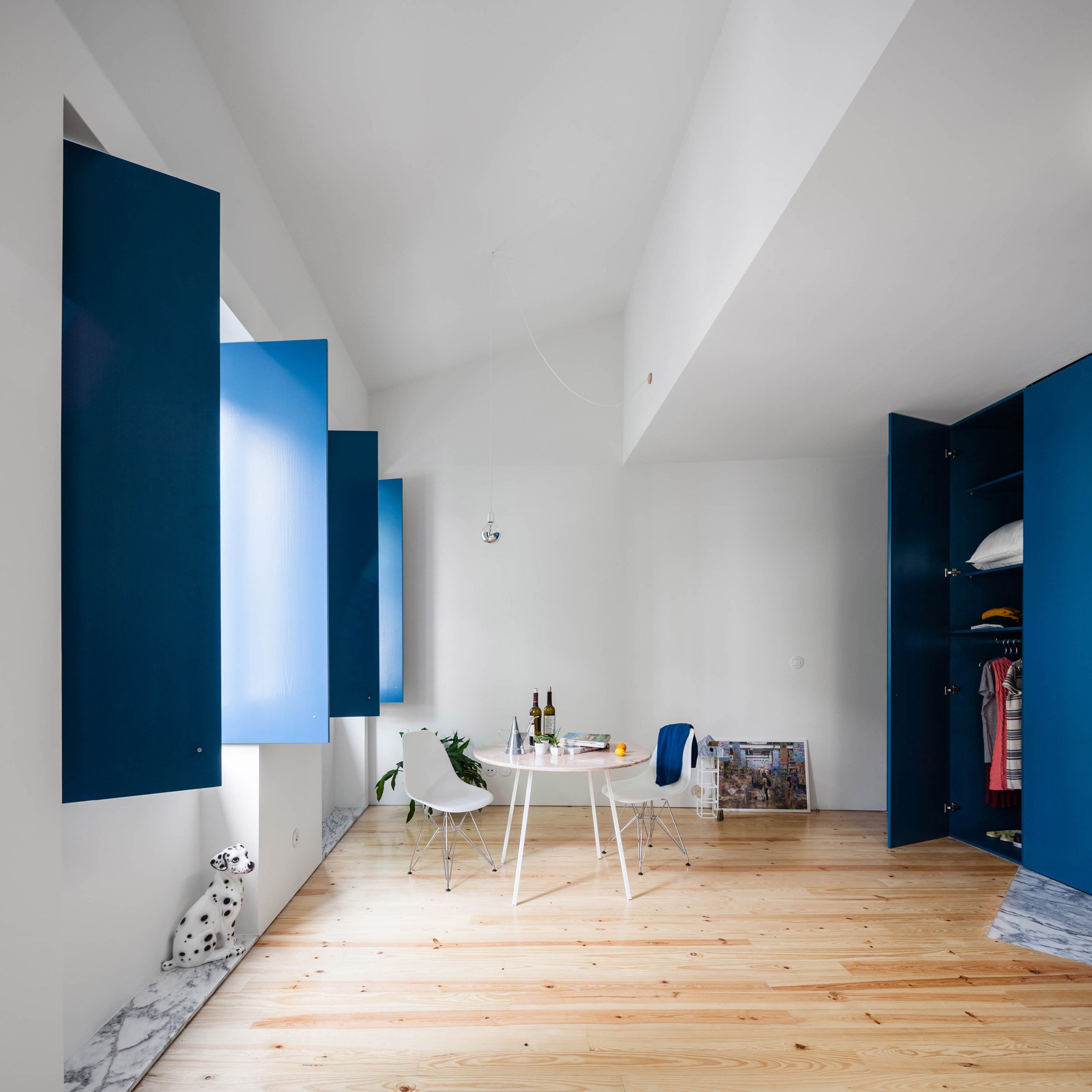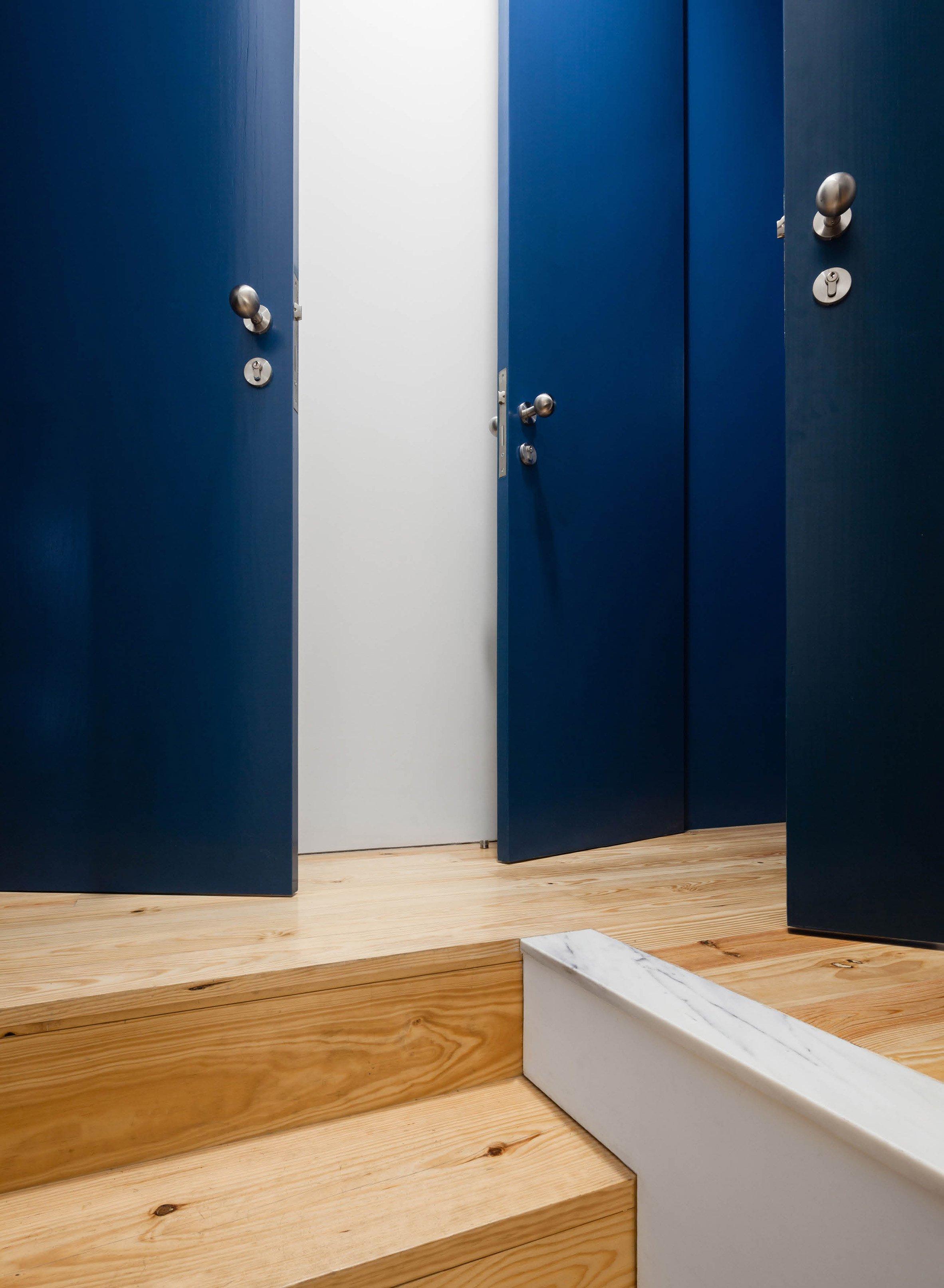 This design varies only slightly between each home, to accommodate the geometry of the staircase, the windows and form of the roof. Strips of grey-veined stone line a low sill below the windows and provide splashbacks in the kitchens. Small pieces of the same stone are set into the wooden floors to indicate the location of the kitchens behind their blue shutters. This stone outline varies between apartments, with a triangle providing the flooring for one kitchen and a semi-circle in another.
