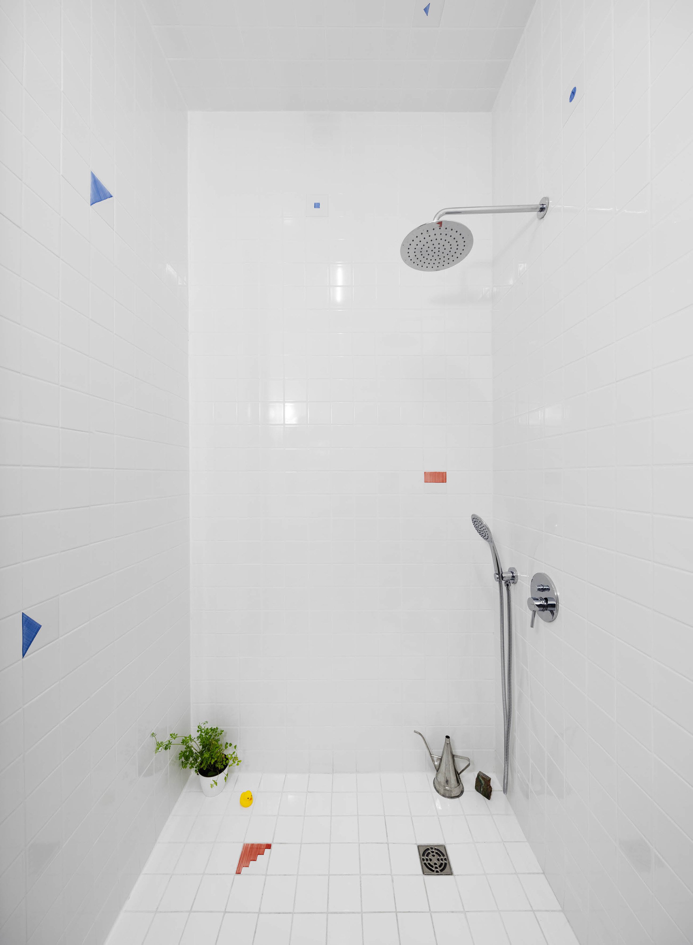 These irregular shapes, echoed in the patterned facade, are also used to embellish the bathrooms. "In each studio, a piece of natural stone with a different form unbalances the apparently symmetrical inner elevations," said the architects. "The street facade acts as a theatrical device, with its unorthodox use of the traditional local tiles."