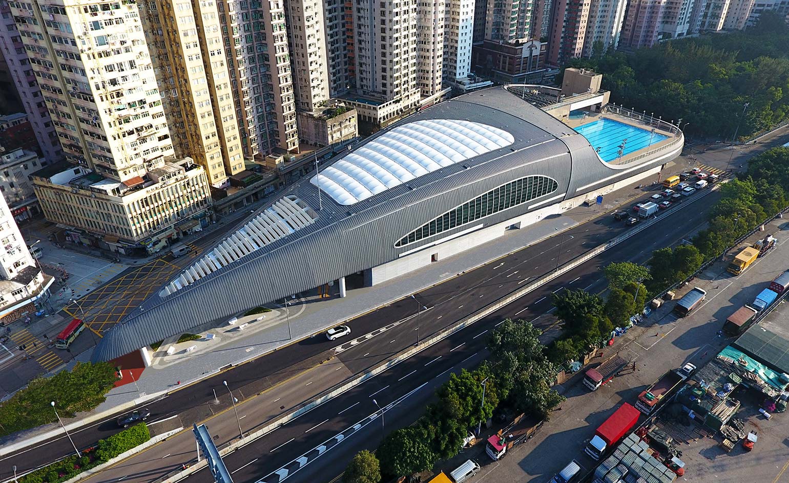 Like a jelly poured into its mould, the futuristic Kennedy Town Swimming Pool flows neatly to the edges of its triangular site between the road and the historic tram-line creating an aero-dynamic form worthy of the sky. Conscious of the urban context, architects at Farrells closely researched the location to create a building that would be respectful of its residential neighbours, yet also an iconic addition to the prominent site with views across the harbour.