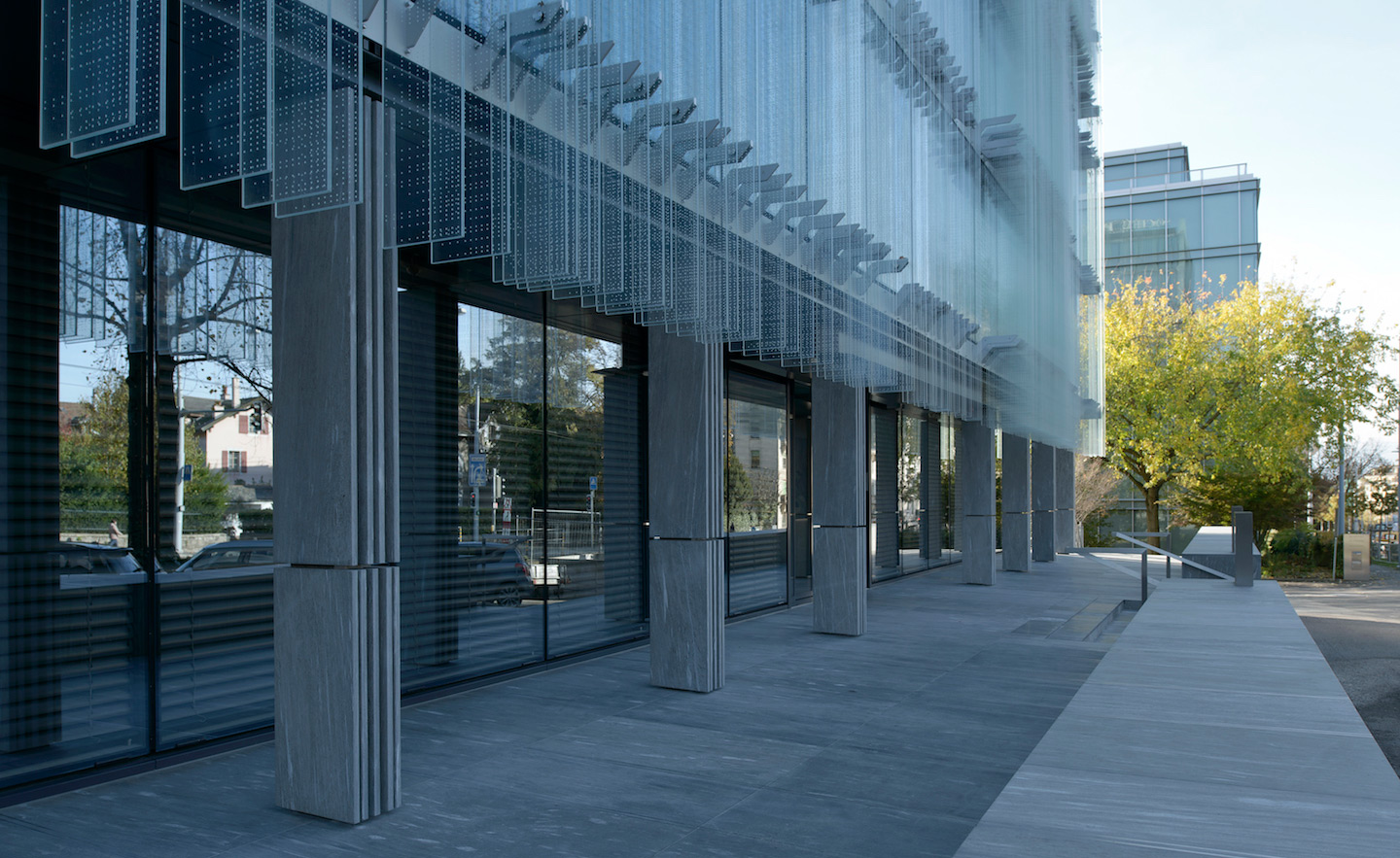 Designed by Italian firm Giovanni Vaccarini Architetti, the new Swiss headquarters of Société Privée de Gérance involved the adaptive reuse and extension of the existing building, and began with redefining the architectural envelope. Creating a blurred effect, the envelope lays screen-printed patterns of squares in a gradient from fully transparent to densely opaque over glass fins composed to make the building highly energy-efficient and optimise the quality of the work space inside. One manifestation of an ongoing research project conducted by the office for 20 years, the textural face of the steel and glass building also generates maximum views out, solar shading, and acoustic and thermal insulation.