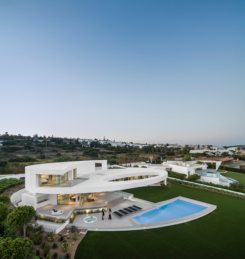 The unified interior and exterior spaces are both an intense white, a characteristic of many homes that extend along the seaside slope. Mário Martins Atelier has sought to create a connection with the existing, neighboring house to the east, relating back to the concept of ‘balance’ which lies at the foundation of the design. This sense of equilibrium can be found throughout the structure. The density of the elliptical base contrasts greatly against the oculus that floats above the outdoor patio area — creating a dynamic relationship between both positive and negative spaces, density and airiness, and light and shade.