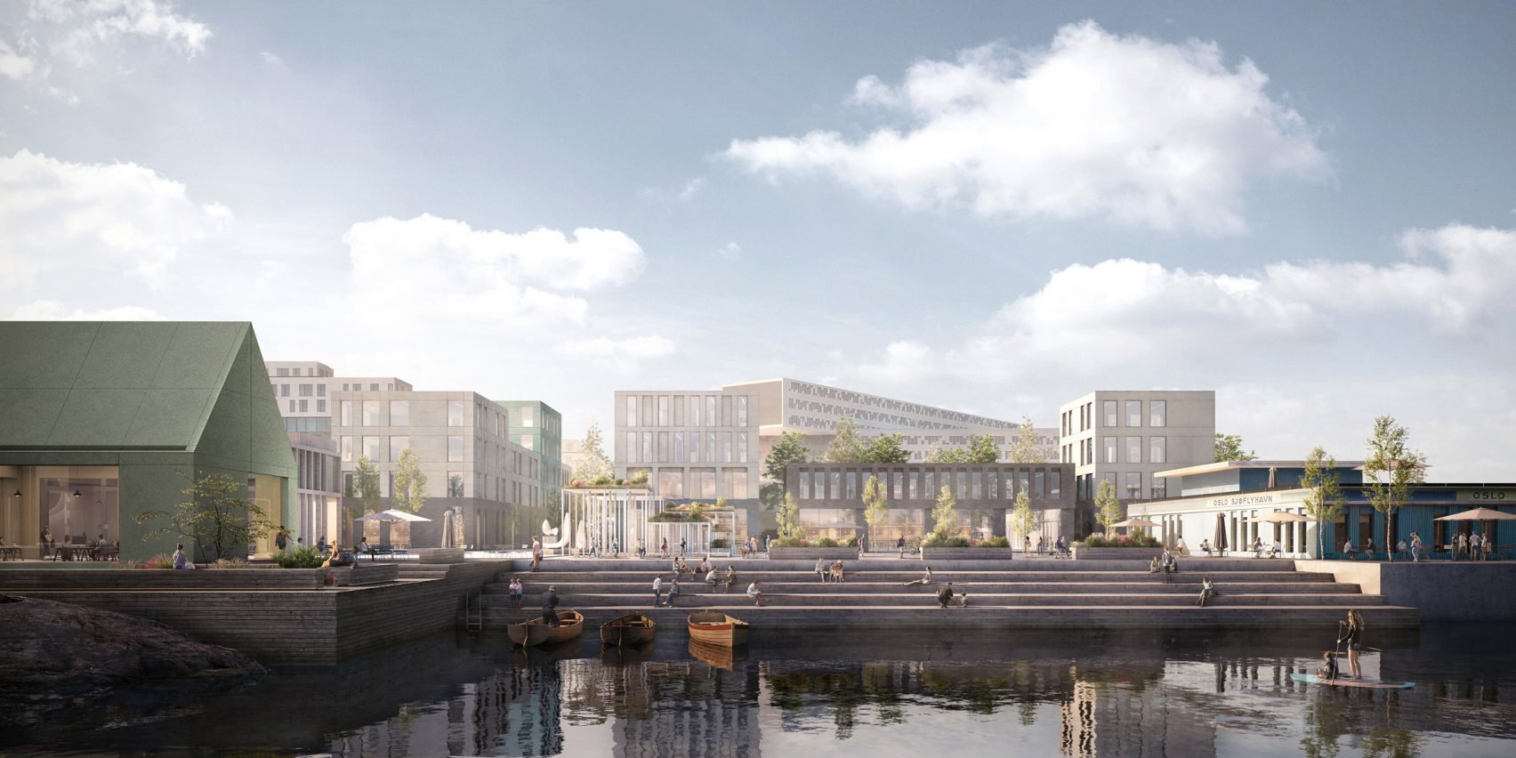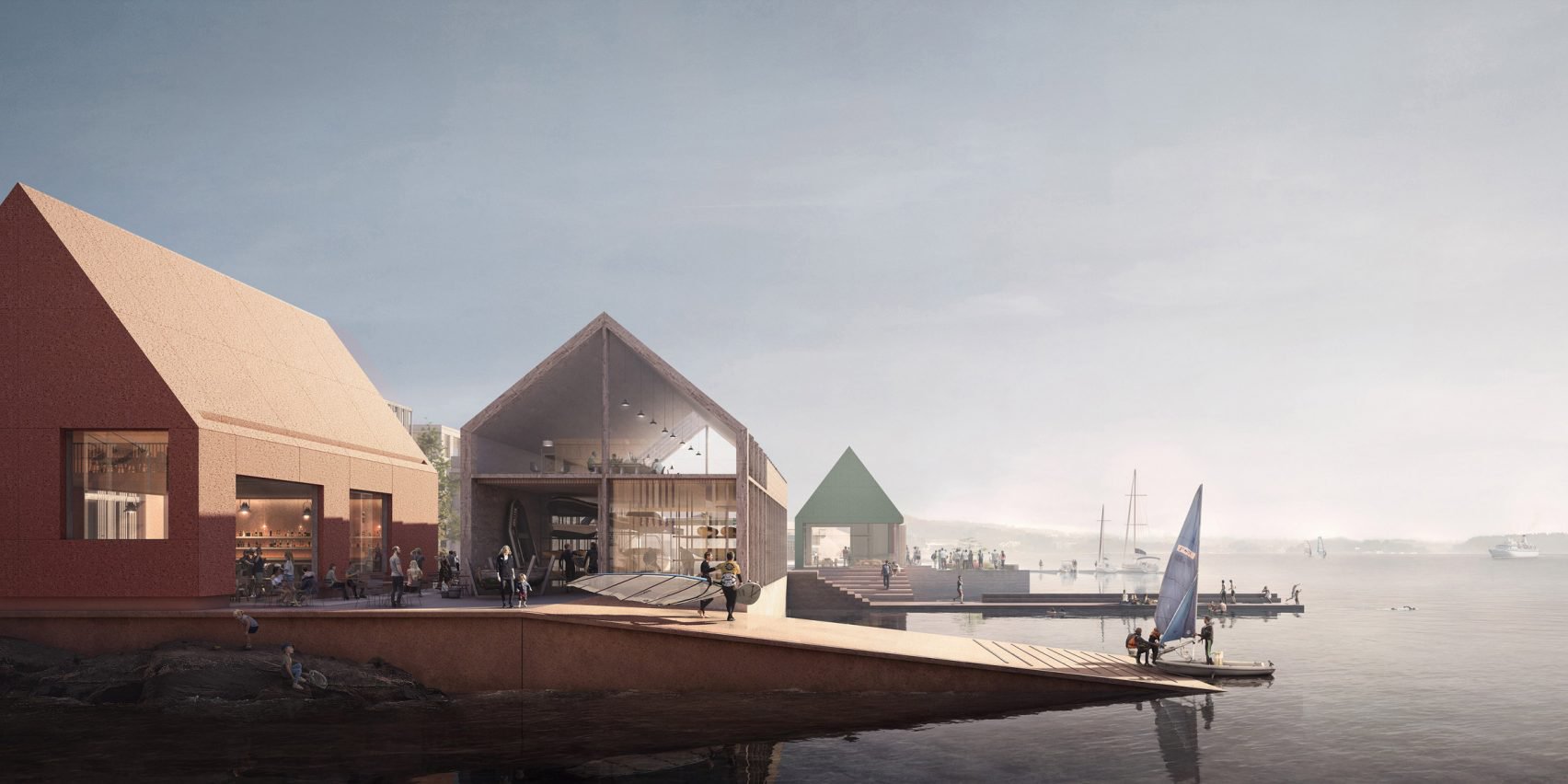 Haptic is working with Norwegian studio Rodeo on the larger transformation project, which will see a variety of water-related activities introduced to the area, including boat and surfing clubs, a new urban beach, restaurants and bars, retail and offices and a seaplane terminal. Crucially, the area will also be served by a new metro link to the city centre as well as a planned ferry link to the waterfront of Oslo city.