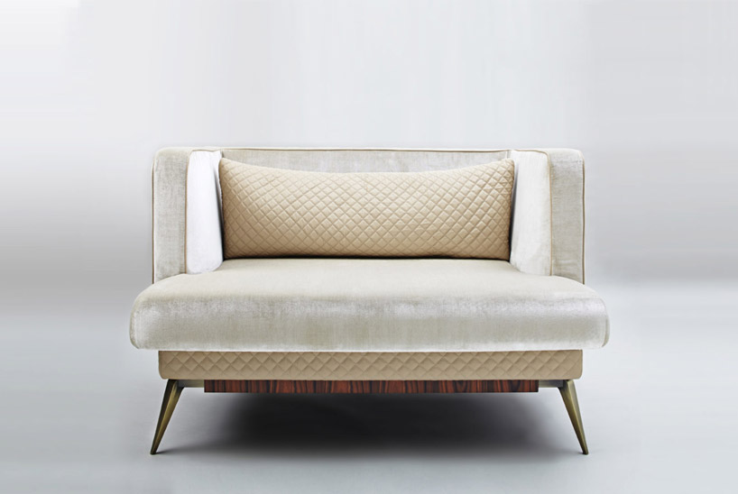 img.3 The ‘Victoria’ armchair is characterized by its quilted padding and satin-finished metal feet.