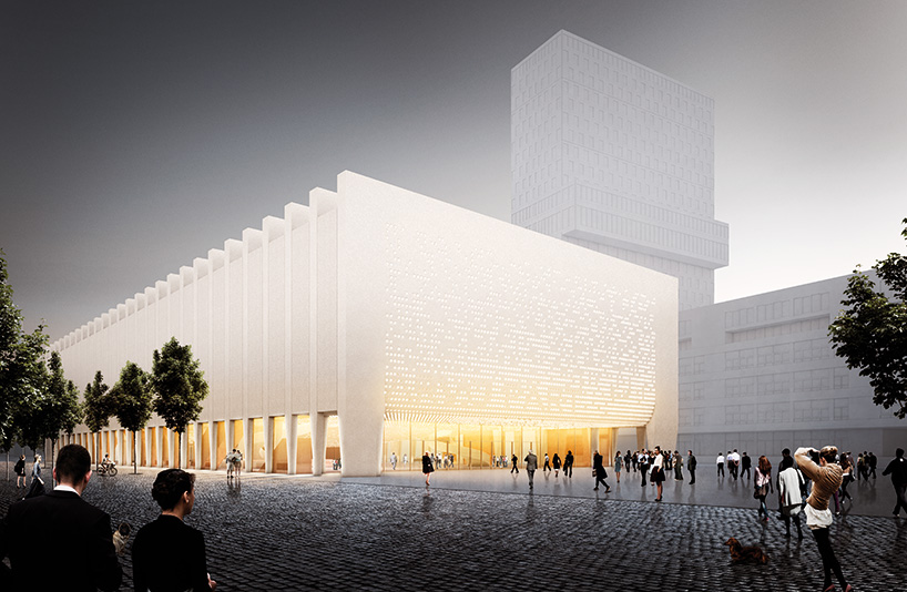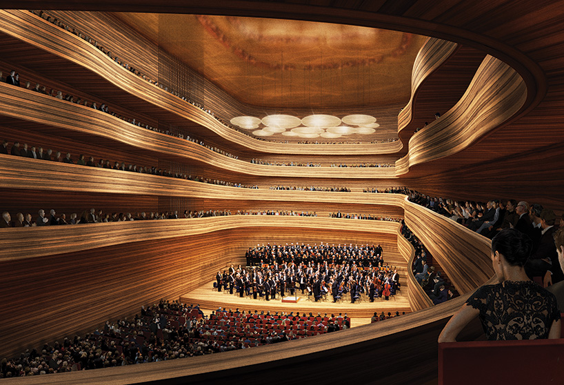 The entry by PFP Planungs, which came in as runner-up, features a façade punctured with small spherical openings. The sculptural shape of the structure has been designed in response to its neighboring buildings, while the main entrance is accentuated and defined by a bold incision in its mass. David Chipperfield’s third placed proposal appears externally as a ziggurat, while internally the smaller hall is found at the top with the main one below. iI the larger auditorium the audience is seated on a continuous ramp, which recalls the form of the staircase that wraps around the building itself.