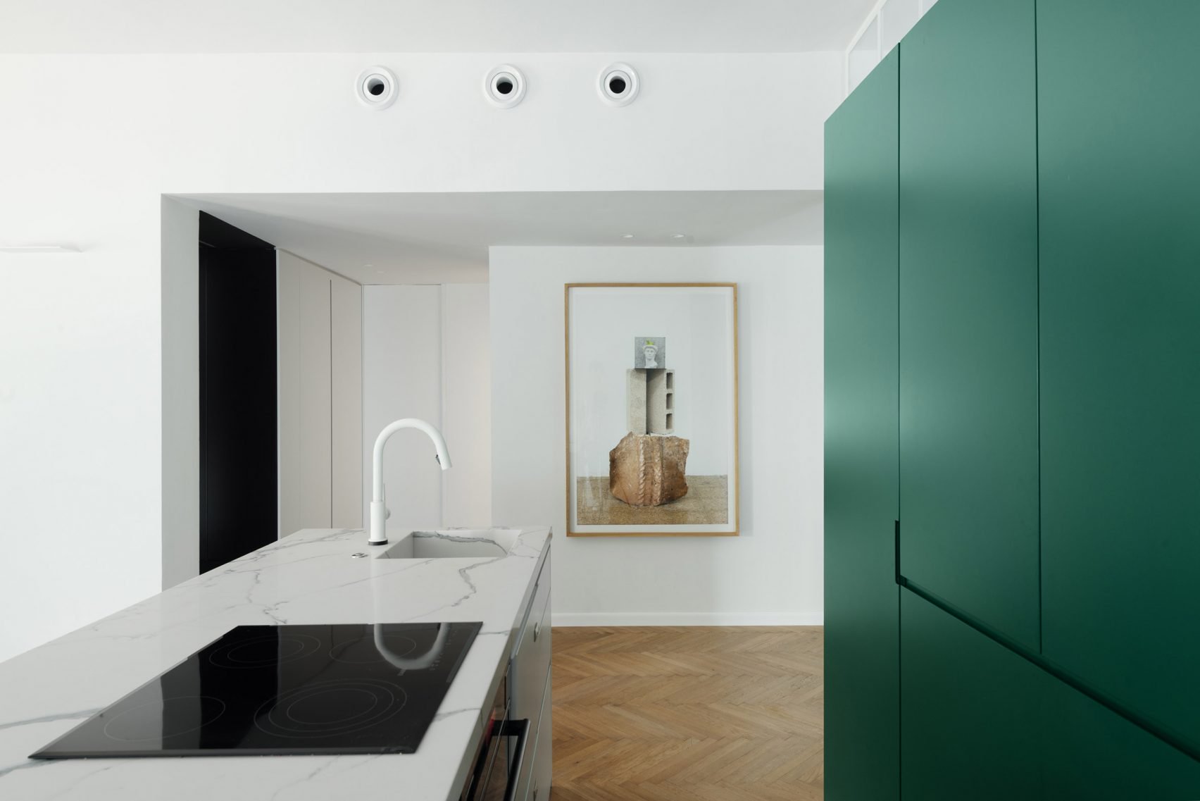 "We decided to create a clean and airy space that contains a series of freestanding elements so they do not hurt its wholeness," they explained. "This led us to implement the conceptual notion of 'islands', which stand alone and float, throughout the apartment."