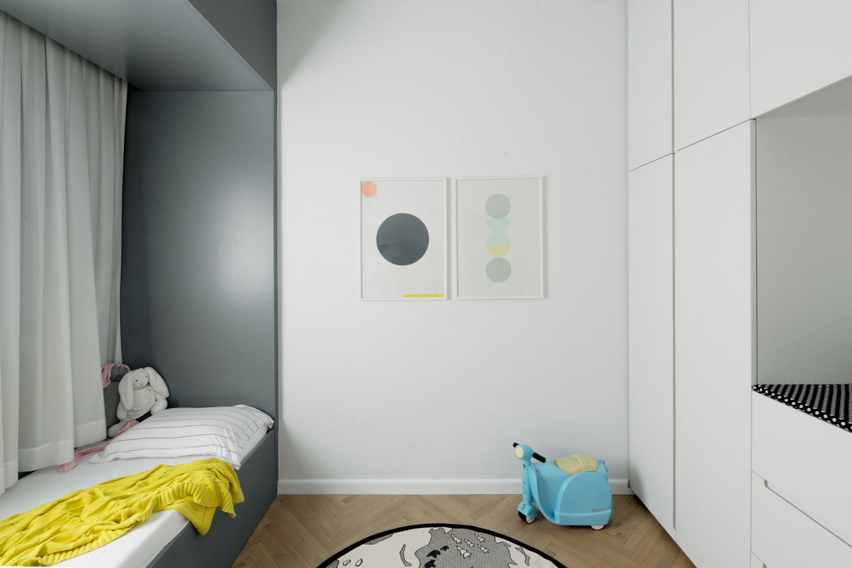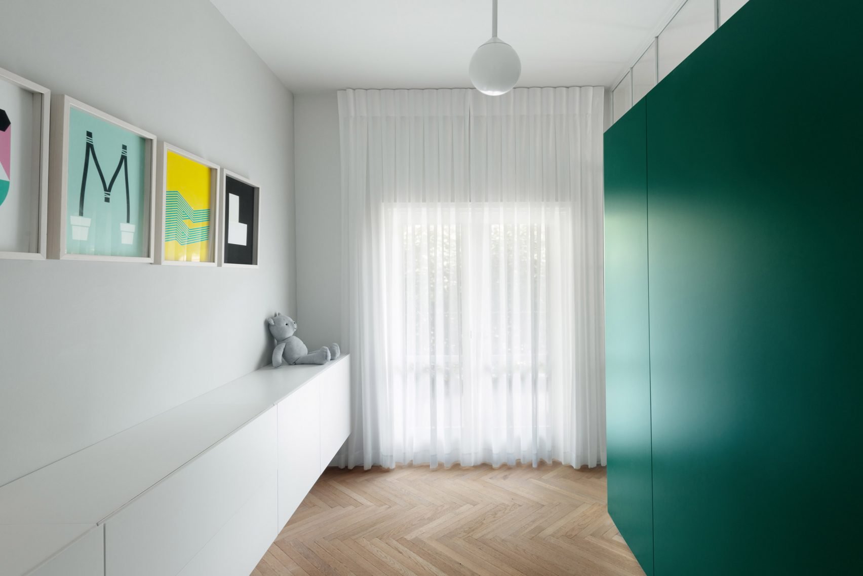 A full-height glazed wall with white gridded framing divides the kitchen from a toy room for Amir and Chen's young son and daughter. The children's bedroom, which only measures at 10-square-metres, has been fitted with a two-person sleeping niche with built-in drawers to maximise space for play.