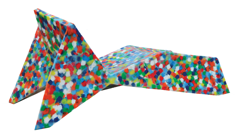 Ecopixel claims that this new method for recycling plastics is composed of 100% low-density polyethylene (LDPE) and melts at 120°C, which means it can be re-melted an infinite number of times without altering its properties. Its low melting temperature means its ecological impact is also greatly reduced during the production phase. The material can be melted into different shapes and colors, without homogenizing color pigments from its ‘raw’ waste material, resulting in a distinctive pixelated appearance.