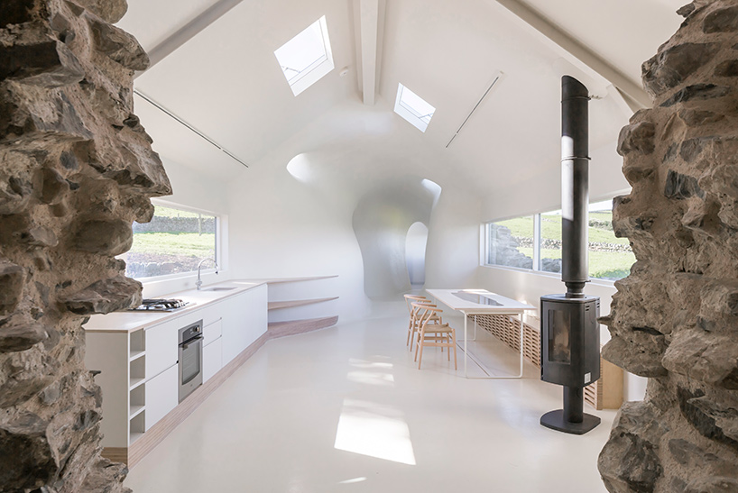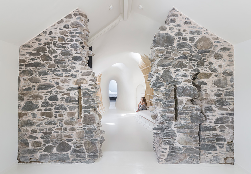 As the original farmhouse had been modified on a number of occasions since its construction, Lily Jencks Studio and Nathanael Dorent Architecture carefully selected a sequence of materials and geometries that would highlight its storied history. ‘The first layer is the existing stone wall, within which sits a black waterproofing EPDM rubber clad pitched-roof ‘envelope’, and within that a curvilinear interior ‘tube’ wall system,’ says the design team. ‘This interior curved surface is made of insulating polystyrene blocks within a gridded wood structure, and is covered with glass reinforced plastic.’