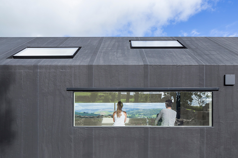 The house’s more public programs, including the kitchen and dining areas, are contained within the ‘tube’, while private areas, (including bedrooms, and bathrooms), are found at each end of the property. The home’s windows and doors are positioned in response to the structure’s existing walls, as well as the views from the site. ‘At the windows and doors the tube funnels out towards the light, creating a ‘poched’ space within the thickness of the tube wall, and between the envelope and the tube, that can be used for furniture and storage,’ explains the design team.