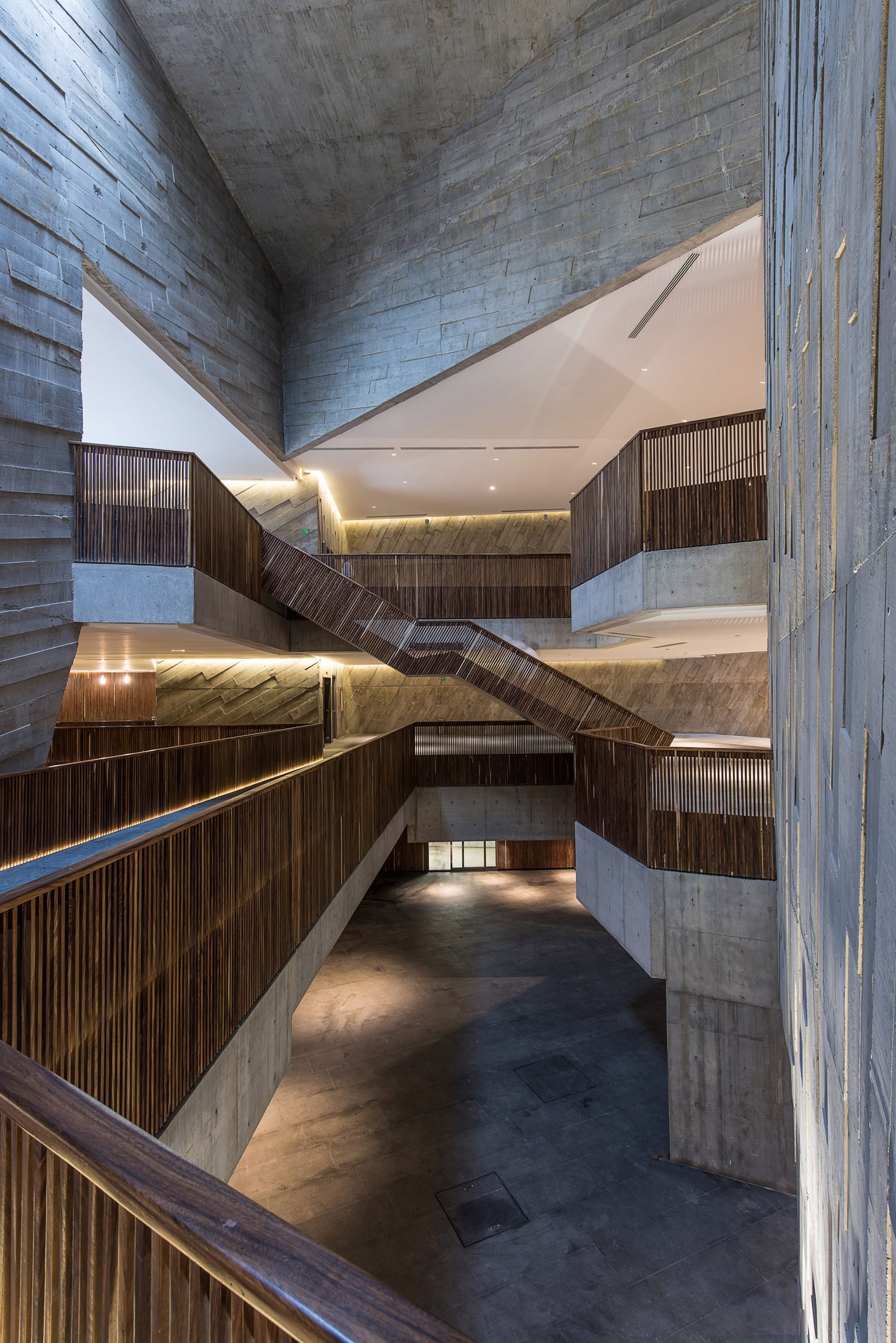 The exposed concrete walls are marked with the texture of wooden boards set in a diagonal pattern. The angles are slightly different on each wall face, creating varying hues and shadows. One of the blocks is slightly raised above the ground to provide a canopy for the entrance. Visitors pass underneath into a triple-height lobby, where board-marked concrete is also left exposed.