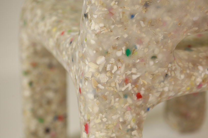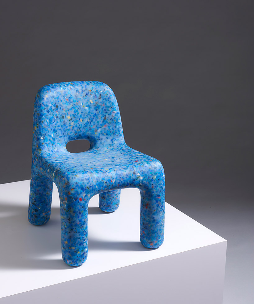 Following an in-depth two-year study period exploring how to sustainably recycle plastic toys, ecoBirdy creates pieces that are 100% made of recycled plastic waste. The process starts by collecting, sorting, cleaning and grinding old and unused toys. Once separated into colors, the flakes are transformed into a single item with a speckled look. Rounded edges and a smooth silky surface result in furniture pieces that are pleasant to touch and easy to clean.