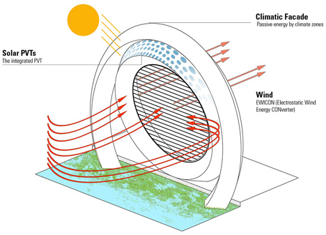 The wind turbine is at the centre but, according to the designers, it won't disturb residents or guests trying to sleep – because it won't make any noise. Unlike traditional turbines that generate energy through the movement of wind-propelled sails, the Dutch Windwheel will require no mechanically moving parts, and will instead use a combination of wind and water to create electricity.