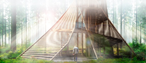 The proposed location is a forest nearby, and the architects want to build 90 per cent of the tower's structure from wood to evoke its natural context. The structure's spiralling form is intended to look like a tree that spreads out at its base and canopy – the result of a hexagonal section that rotates gradually as the tower ascends.