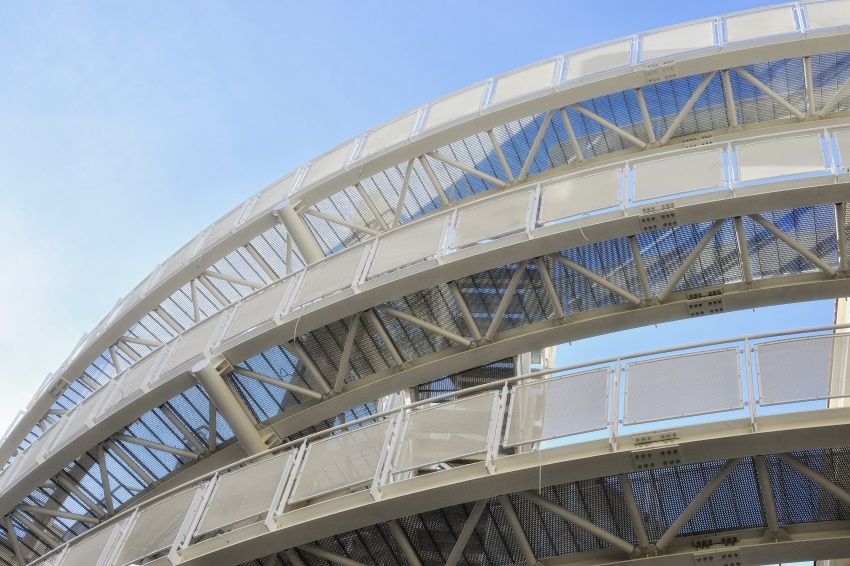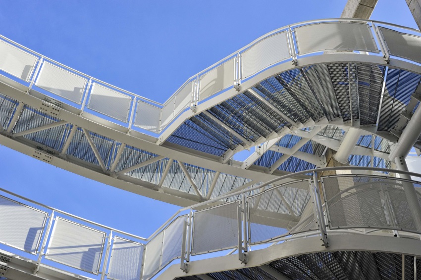 The staircase is inserted amidst raised walkways, inside an arched partition in reinforced concrete that functions as a central structural support. The structural framework, also exposed in the design as an aesthetic-formal solution, combines calendered H-beams with a cylindrical-section reticular system. The sheets of expanded metal used for the parapets and the horizontal segments contribute to convey a sense of lightness and “transparency” of the whole structure.