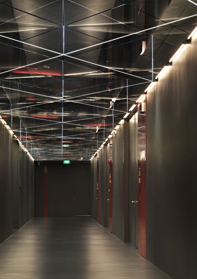 The Barrisol film, which “lights up” in a uniform way, is stretched at its base. At the top, concealed by the structure, fluorescents create an area of light and detachment from the architectural structure, making the lamp more self-contained and independent. “XXX” has been designed for the ceilings of the two main corridors. It is a long box of mirrors that virtually expands the space below. The reflecting surface it etched by strips of Plexiglas that form a modular geometric grid, lit from behind by Leds.