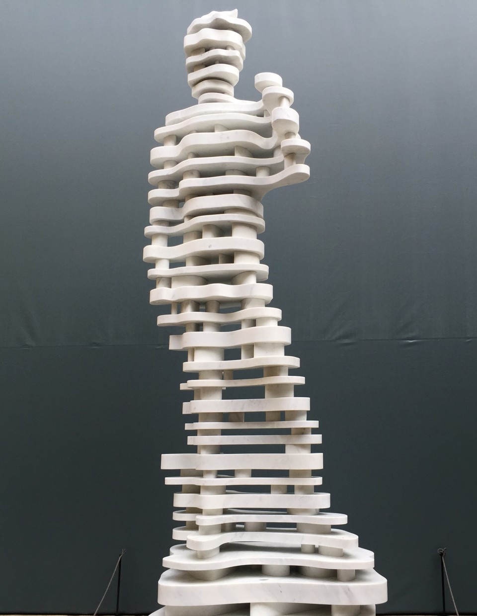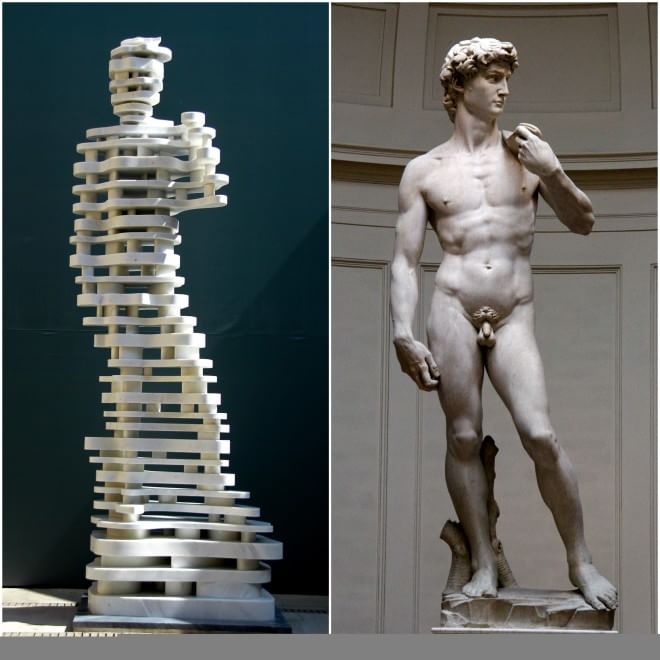 Saracino states, “I never would have expected, two years later, to receive the great honor to see a new edition of “Hero” in the Accademia of Florence, in the same place as Michelangelo’s “David.” With the New York “Hero,” I wanted to create a symbolic protector of New York City, as “David” was intended as protector of Florence. The statue celebrates the superhuman and the inspiration that it channels. The anthropomorphic layered architectural constructions display the universal ability of mankind to cement its own presence in the world with its perennial construction skills.”